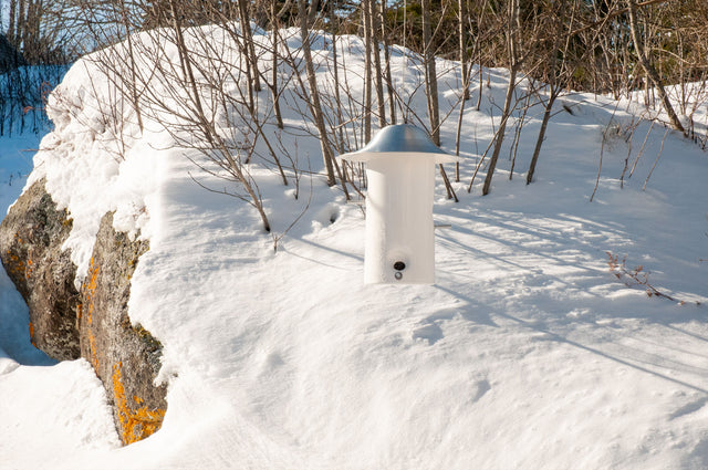 The in-spot for birds? Your backyard. Rainy day protection of your birdseed is ensured with the Bistro Bird Feeder. Perfect for birders in wet climates, the feeder consists of a stoneware feeding tube with an aluminum cover. Each of the four sides of the feeder contains a feeding hole, allowing birds to approach from all sides. Stoneware in our signature glossy finish means a slippery, durable finish that deters squirrels. Available in four colors: light aqua, goldenrod yellow, sumac red, and bright white. Additional custom colors can be made to order here.