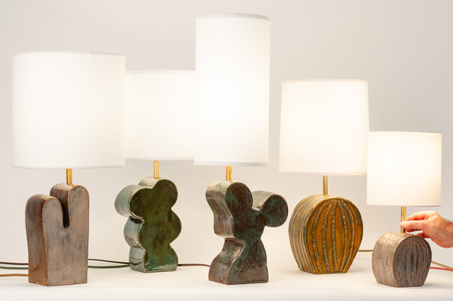 Organica Cactus Table Lamps are a study in light, form, and elemental beauty. Each one-of-a-kind piece begins as hand-formed stoneware, shaped into a modern cactus silhouette that feels both architectural and alive. Fired and glazed in radiant finishes, these lamps glow with a quiet intensity.