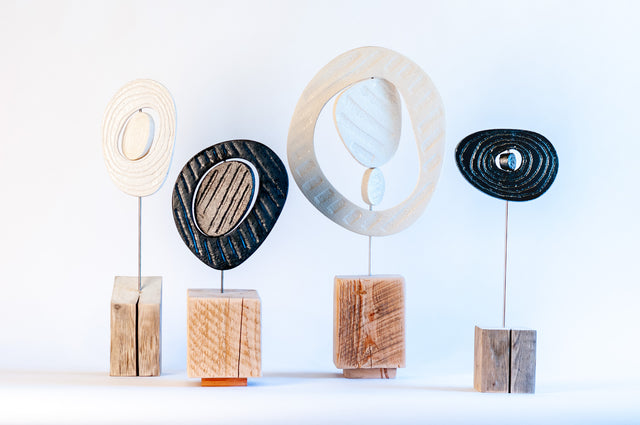 Introducing our stoneware and wood Zen Sculptures: a harmonious fusion of nature-inspired design and tranquil elegance. Crafted with meticulous attention to detail, these pieces are more than just a sculpture; they are a symbol of serenity and balance. Peter and Jim collaborate on their creation and bring them to life. Jim is responsible for creating the stoneware shapes and Peter is responsible for creating the wooden bases and assembling them with stainless steel rods. They trust each other to inspire and complete a shared vision of tranquility and balance. Our Zen Sculptures invite you to slow down, reflect, and find your inner balance. Each sculpture is a unique one-of-a-kind object.